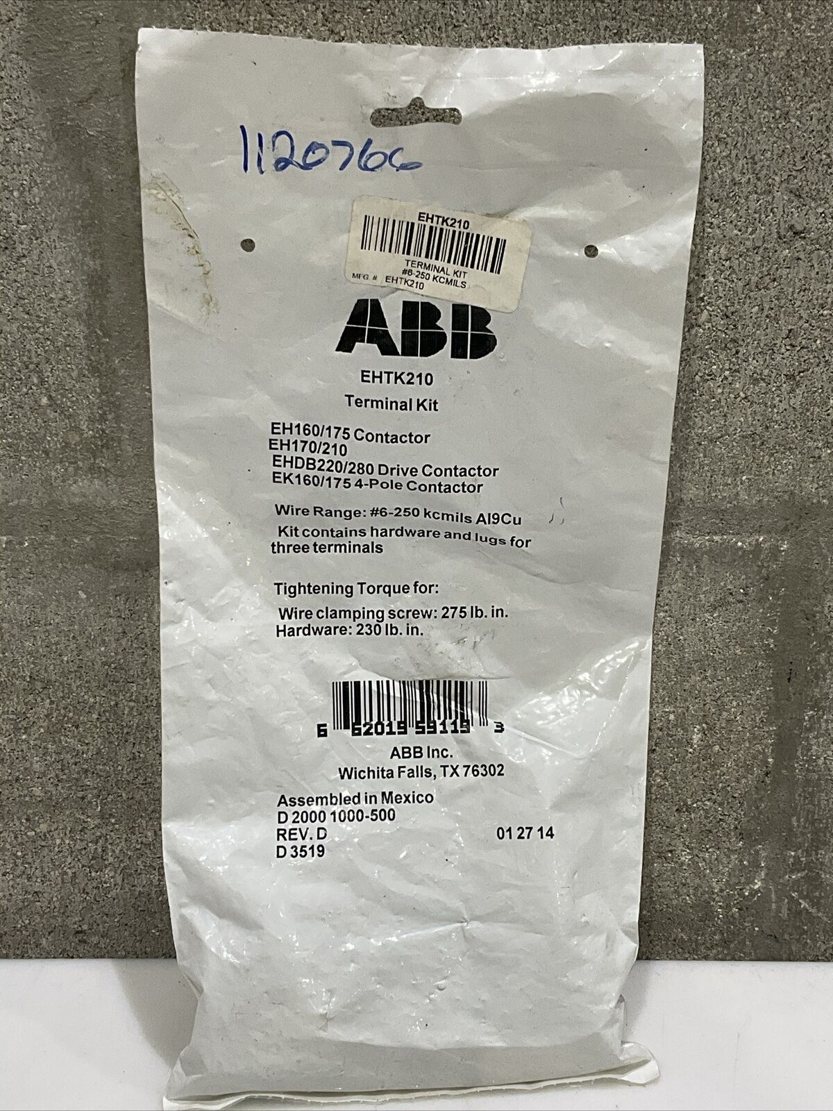 ABB EHTK210 EH160/175 CONTACTOR TERMINAL KIT U4M
