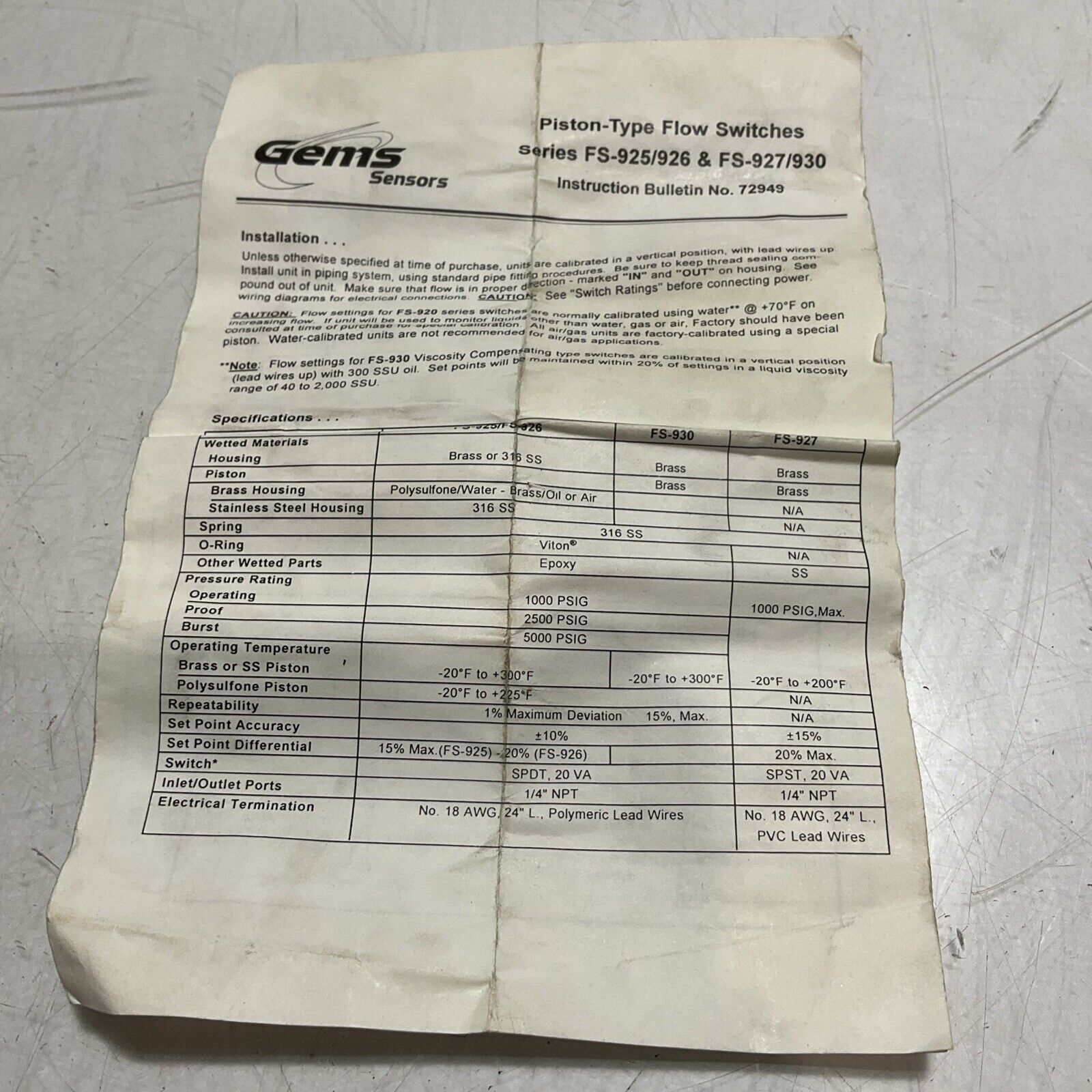 GEMS FS-925-170496 SENSOR , SWITCHES AND FLOW SUPPLY U3S
