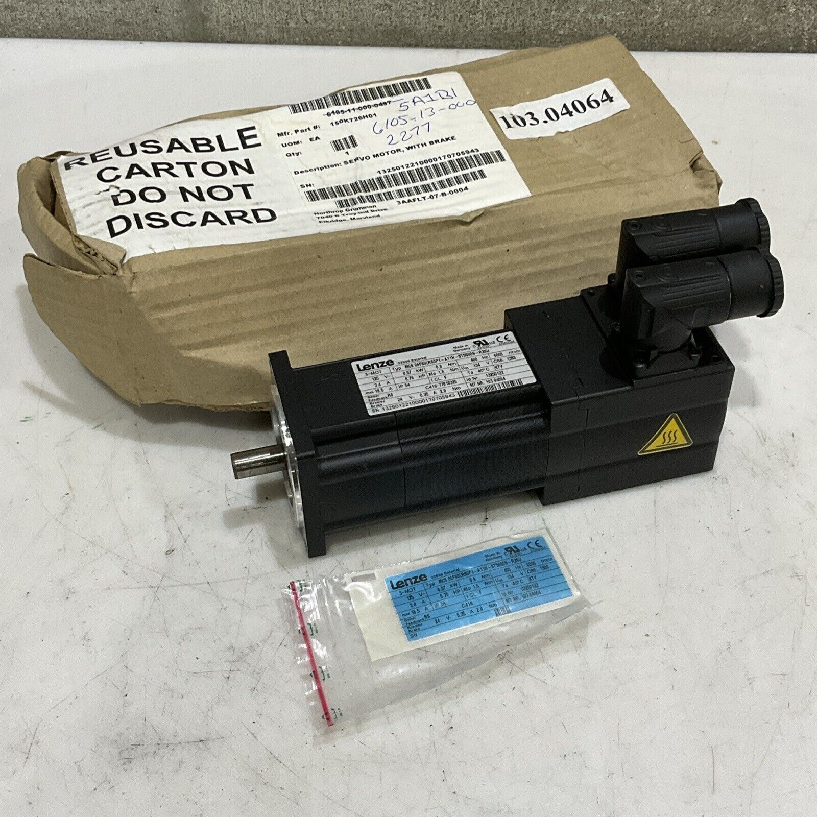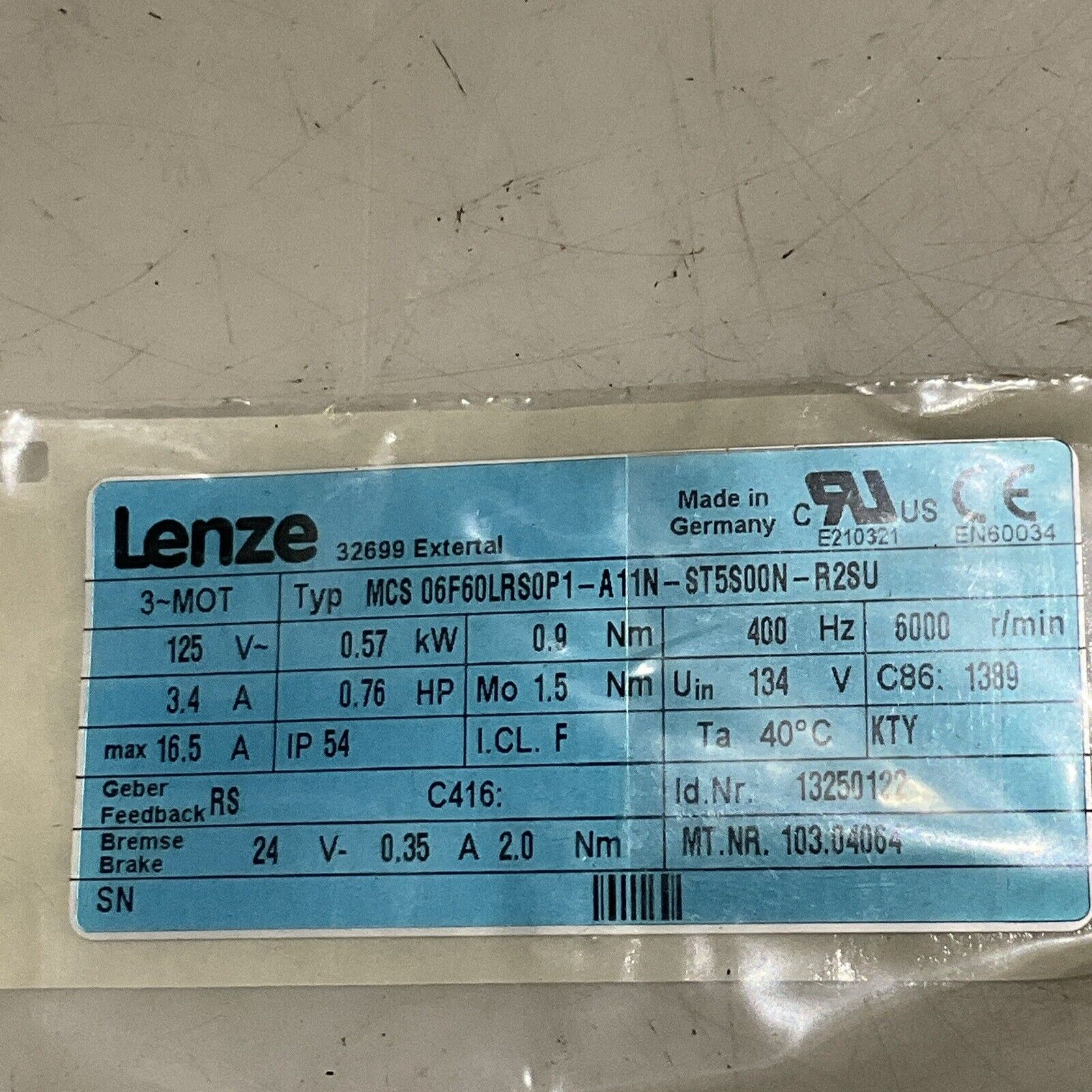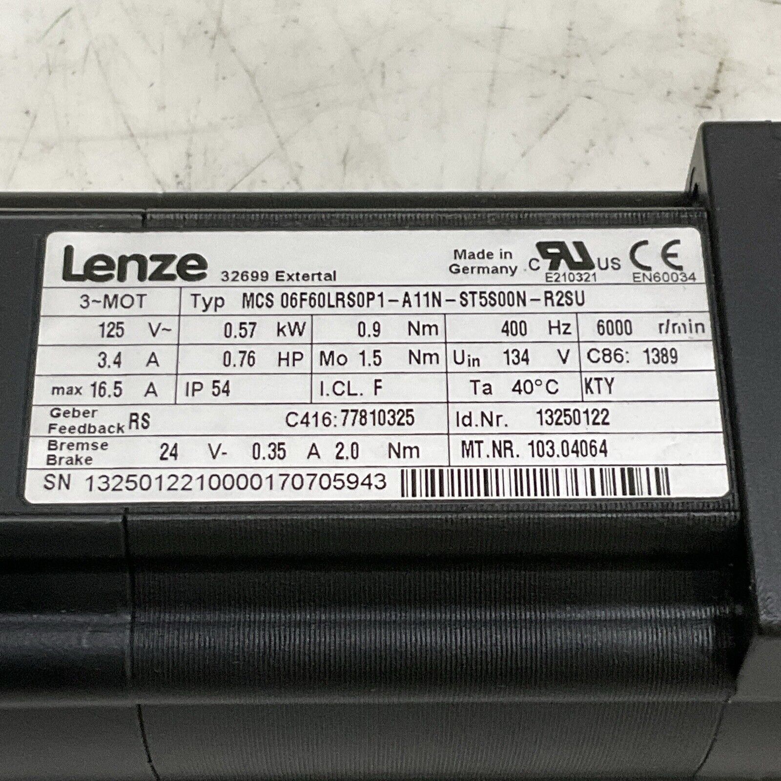 LENZE MCS 06F60LRS0P1-A11N-ST5S00N-R2SU SERVO MOTOR 125 V 3.4/16.5A 400H U3S