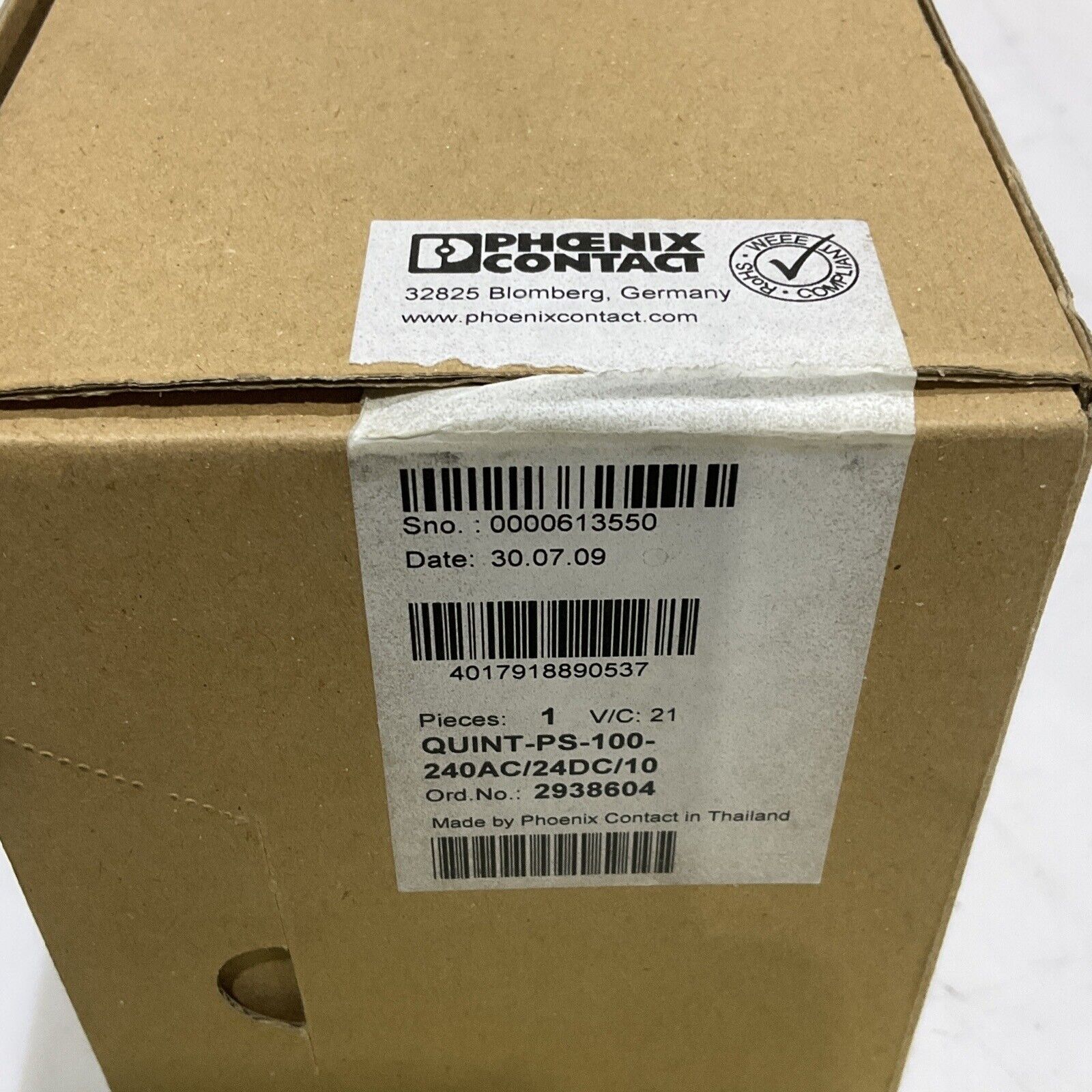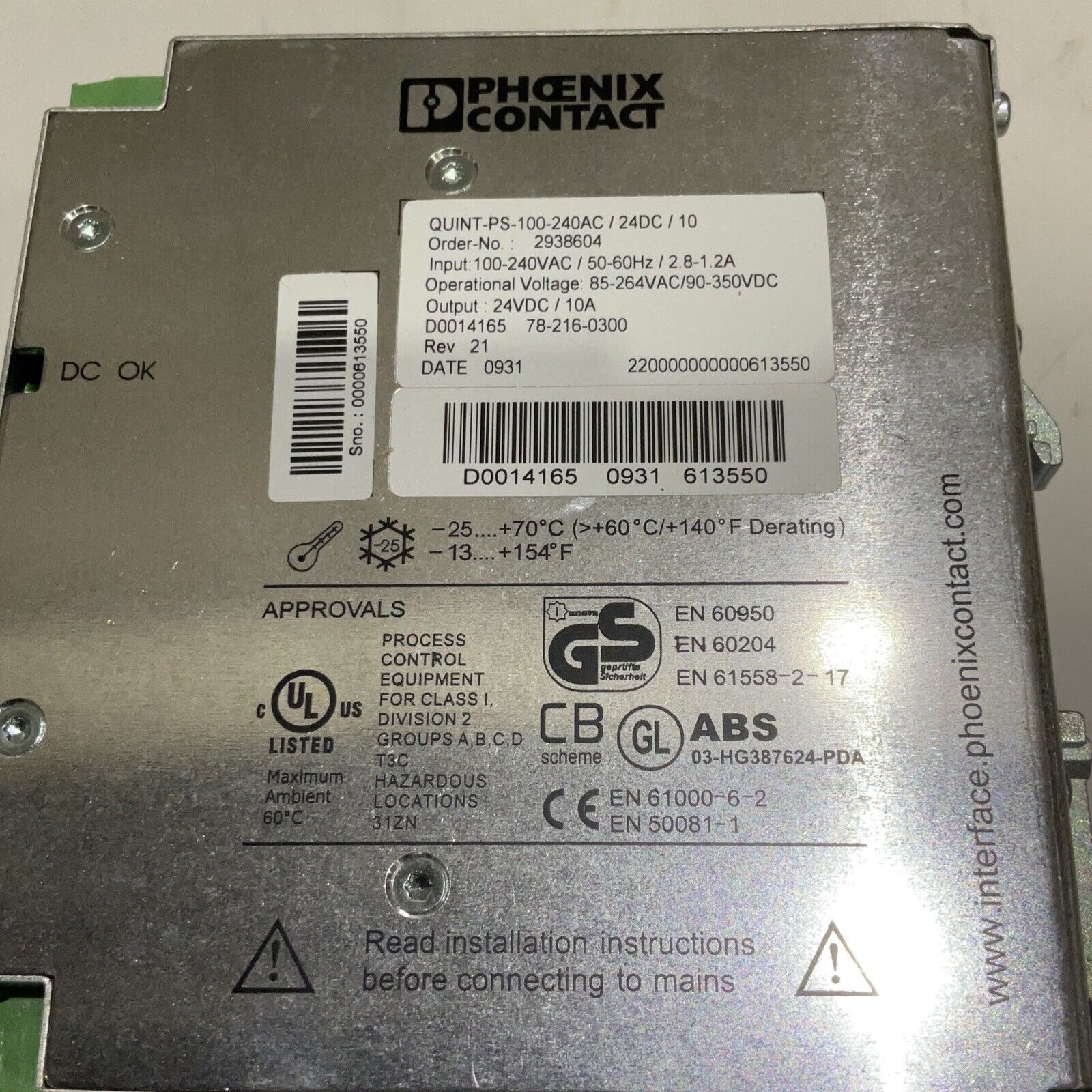 PHOENIX CONTACT 293604 POWER SUPPLY QUINT-PS-100-240AC 50-60 HZ 2.8-1.2A U3S