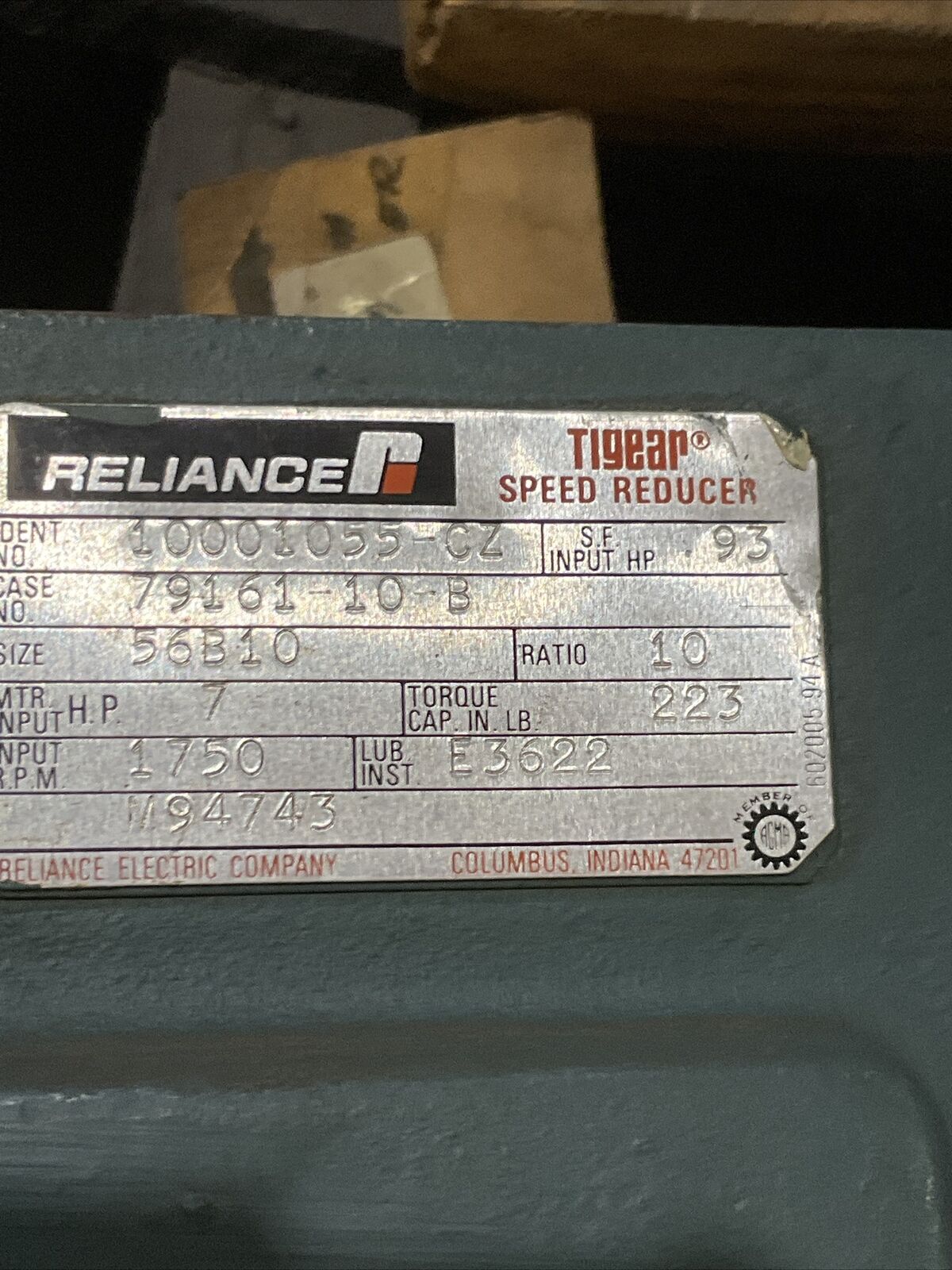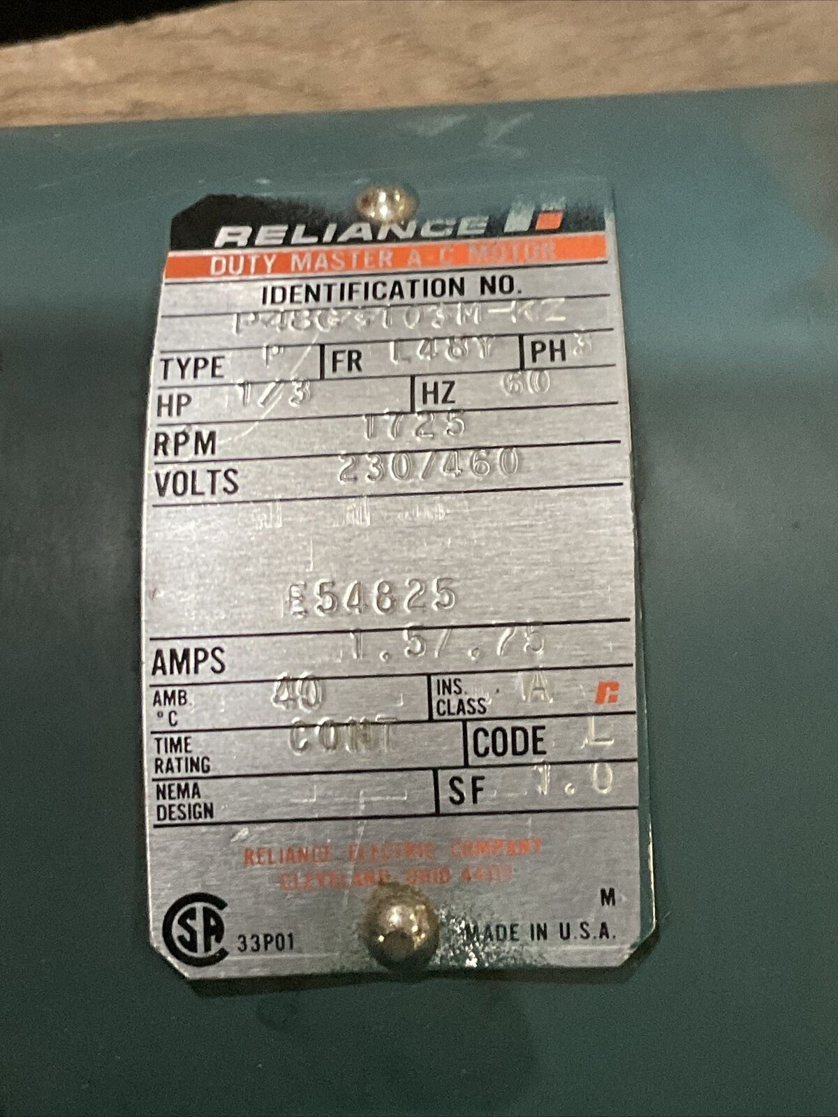 RELIANCE P48G3103M-KZ DUTY SPEED REDUCER W/ AC MOTOR 1750RPM U3S