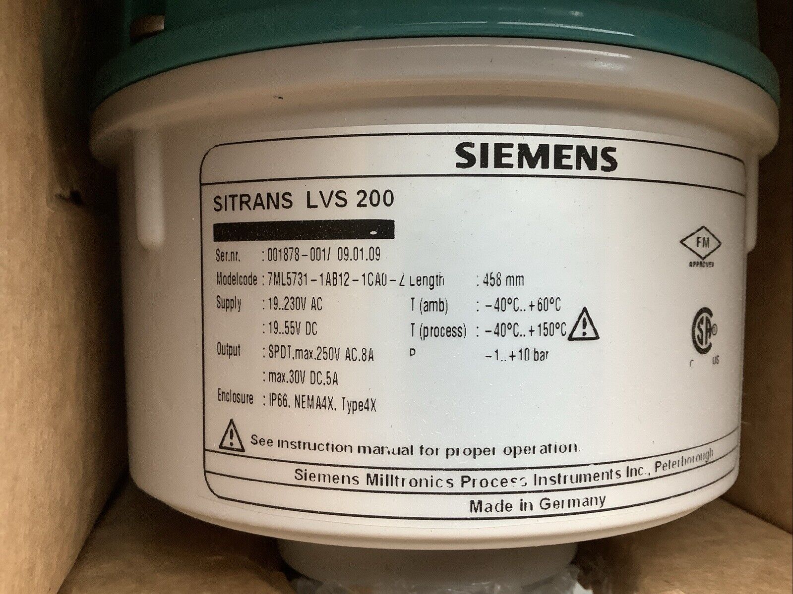 SIEMENS 7ML5731-1AB12-1CA0-Z LVS200 VIBRATING FORK POINT LEVEL SWITCH 458MM