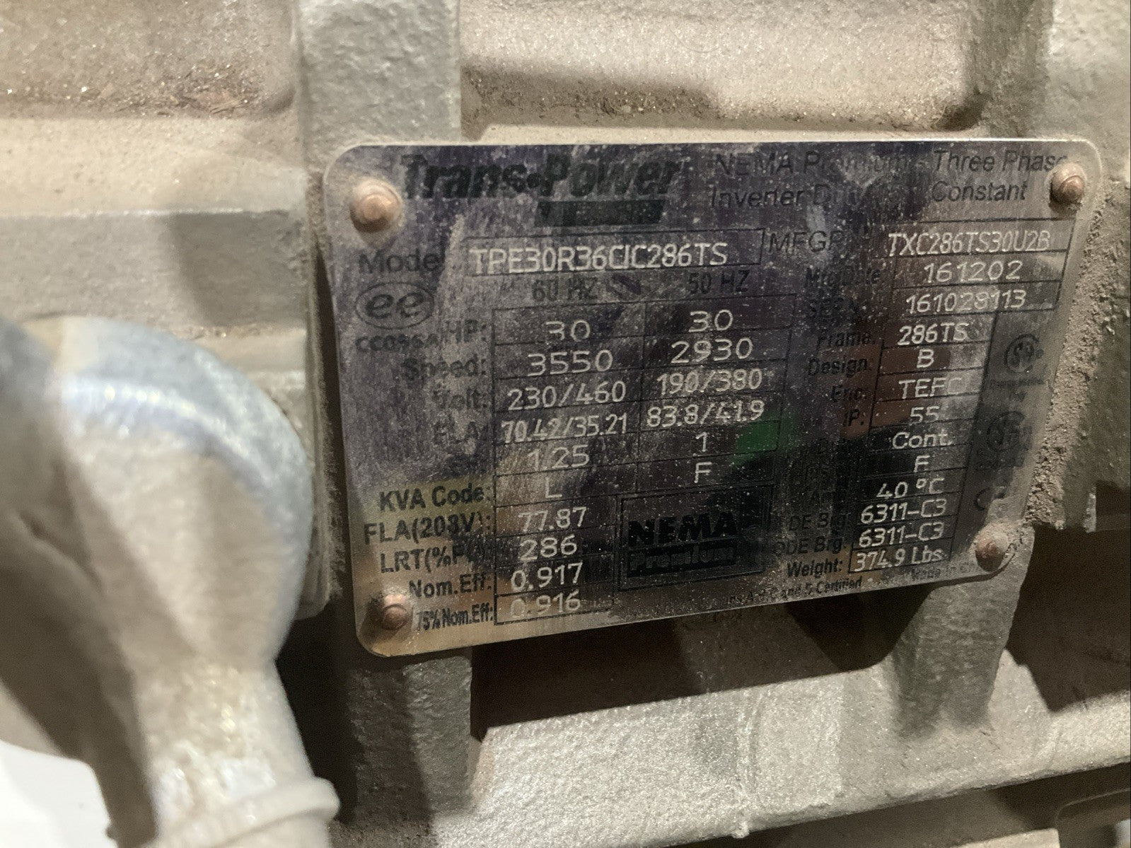TRANS POWER TPE30R36CIC286TS MOTOR 3PH 460V 30HP 60HZ 3550 RPM T2M